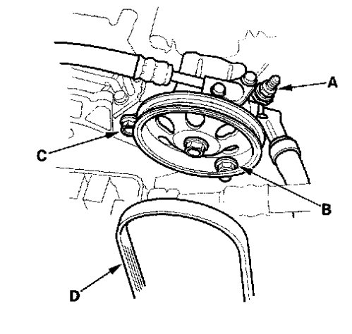 6. Loosen the adjusting nut(A), locknut(B) and mounting bolt(C), then remove the power steering pump belt(D). Check (fig 4) below.