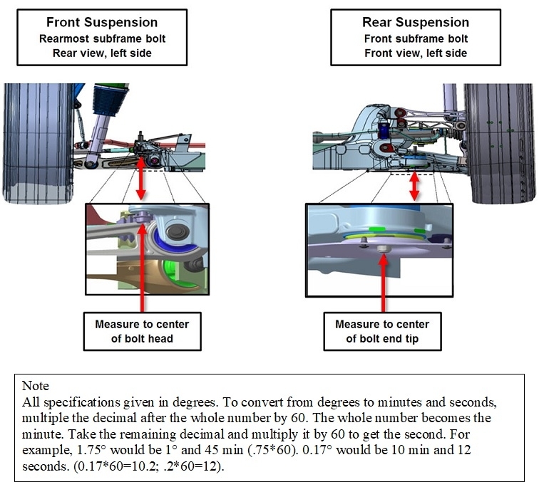 Where I would start is by measuring ride height. The specs are included in these images below. The ride height will take some work to interpret what they're looking for. You might instead consider visiting any tire and alignment shop for the height information. They all have small books that list every model and year, where to take the measurements, and what they should be. It looks to me like what they're asking you to do is the same as Chrysler's method where you take two readings per corner, then subtract one from the other to get the value. They do that indirect method because it eliminates the variable for different size tires. It's not important how high the car is off the ground. The readings we're after refer to the angle of the control arms, and the related geometric angles.