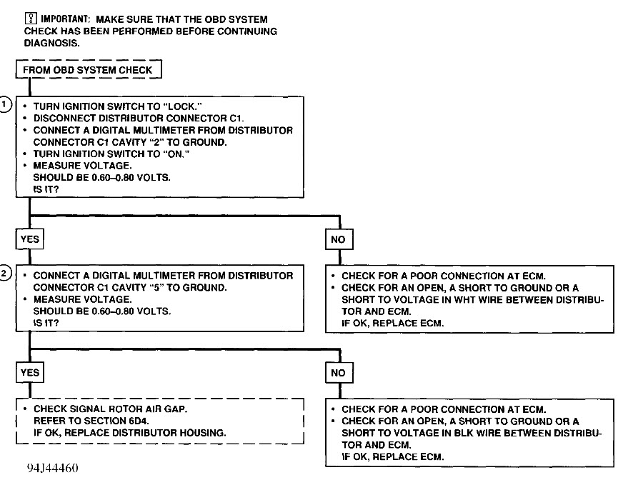 Check for a cracked distributor or rotor cap and connections at ECM then follow checks on chart. That code means there is no rpm signal so it may be a bad ECM.