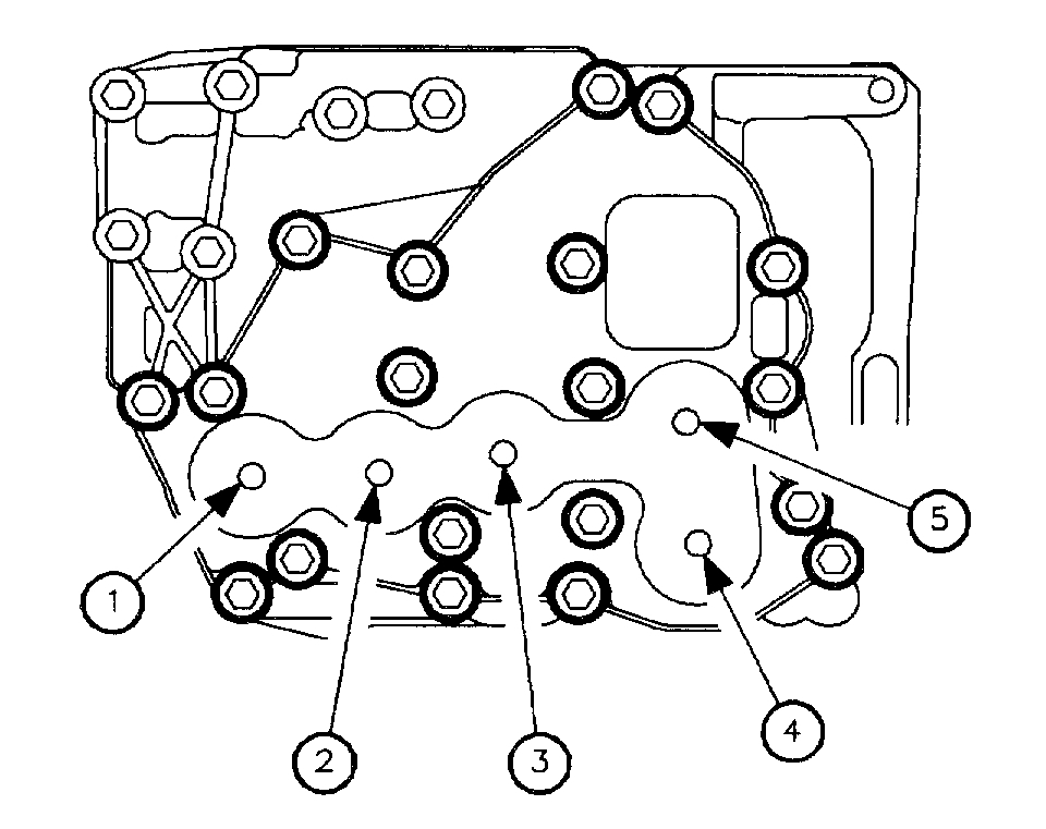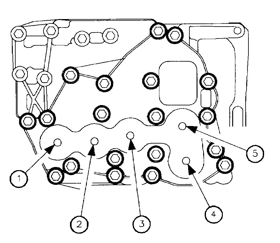2. Remove solenoid cover-to-valve body bolts (identified by the heavy circles) and remove solenoid cover. The solenoids are identified below: