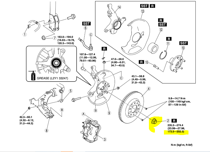 I attached what I believe you are looking for. It is an exploded view of the front suspension, axle nut, and other torque specifications.