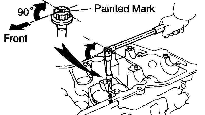 d) Mark the front of the cylinder head bolt head with paint.
