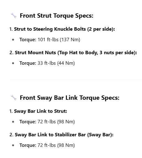 Here are the torque specs for the front struts and links. Check out the images (below). Let us know if you need anything else.