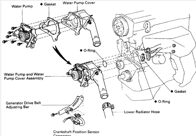 Here are diagrams to help you change out the water pump. First disconnect the battery and drain the coolant. You will need to remove the timing belt so you might as well replace it. Check out the images (below). Let us know if you need anything else.