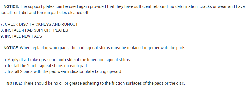 NOTICE: The anti-squeal springs and support plates can be used again provided that they have sufficient rebound, no deformation, cracks or wear, and have had all rust, dirt and foreign particles cleaned off.