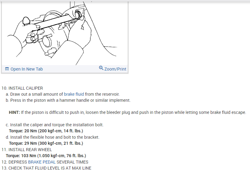 HINT: If the piston is difficult to push in, loosen the bleeder plug and push in the piston while letting some brake fluid escape.