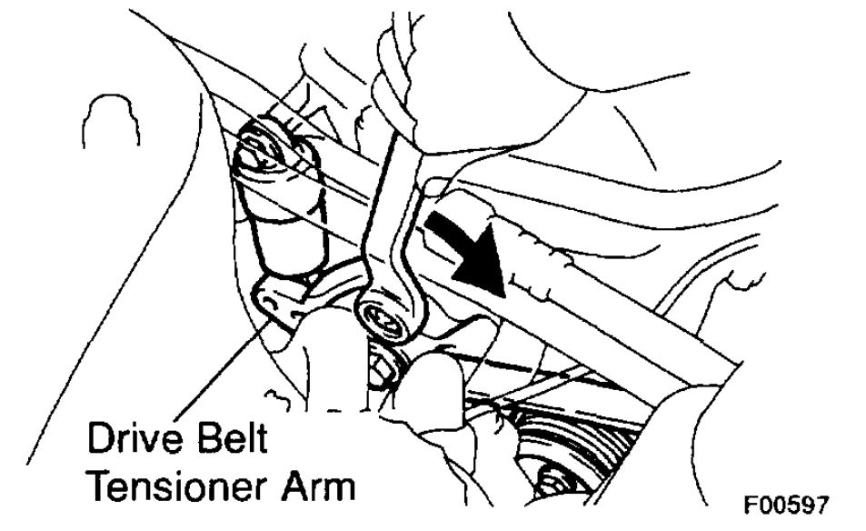 Loosen the drive belt tension by turning the drive belt tensioner arm clockwise, and remove the drive belt.