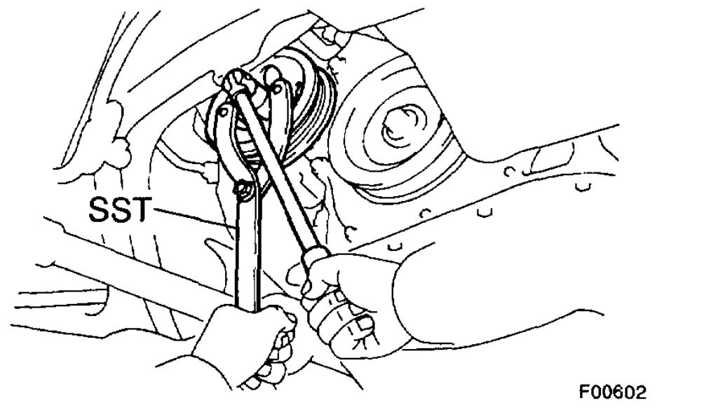 Using Special Service Tool (SST) 09960-10010 (09962-01000, 09963-01000) or equivalent, to stop the pulley rotating, remove the nut.