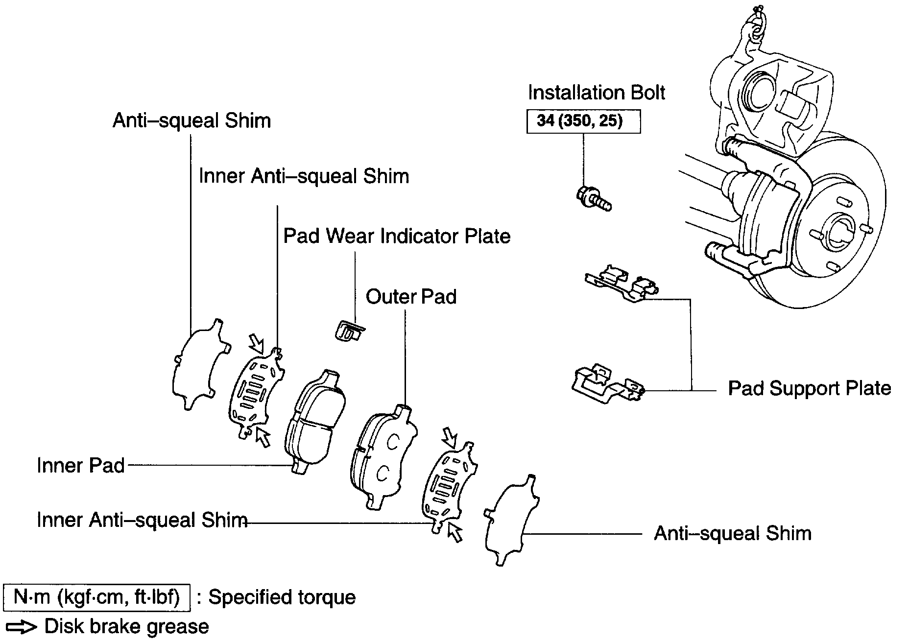 b. Apply disc brake grease to both sides of the inner anti-squeal shims.