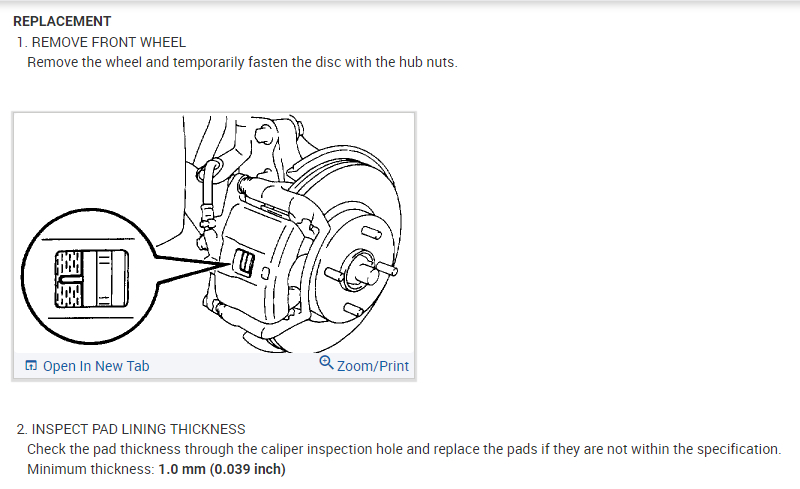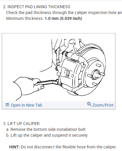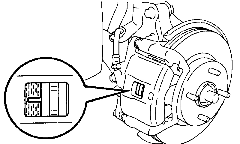 Check the pad thickness through the caliper inspection hole and replace the pads if they are not within the specification.
