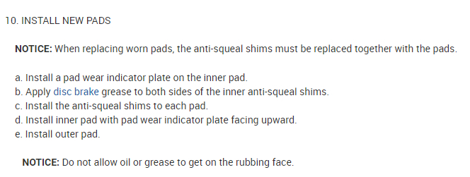 c. Install the anti-squeal shims to each pad.