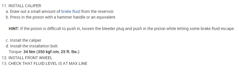 HINT: If the piston is difficult to push in, loosen the bleeder plug and push in the piston while letting some brake fluid escape.
