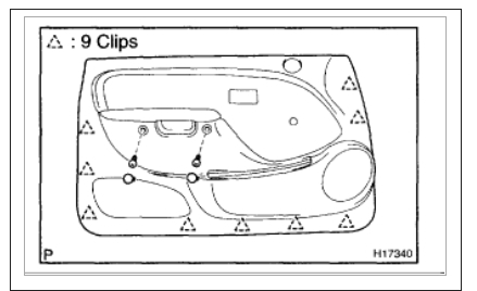 On models without power windows, remove window crank handle. Remove screw and slide interior door handle forward and remove handle from control link. Remove door lock bezel. On models with power windows, remove clip from armrest panel and disconnect electrical connectors. On all models, remove 2 screws. Pry interior door panel loose from door. Lift upward and remove door panel.