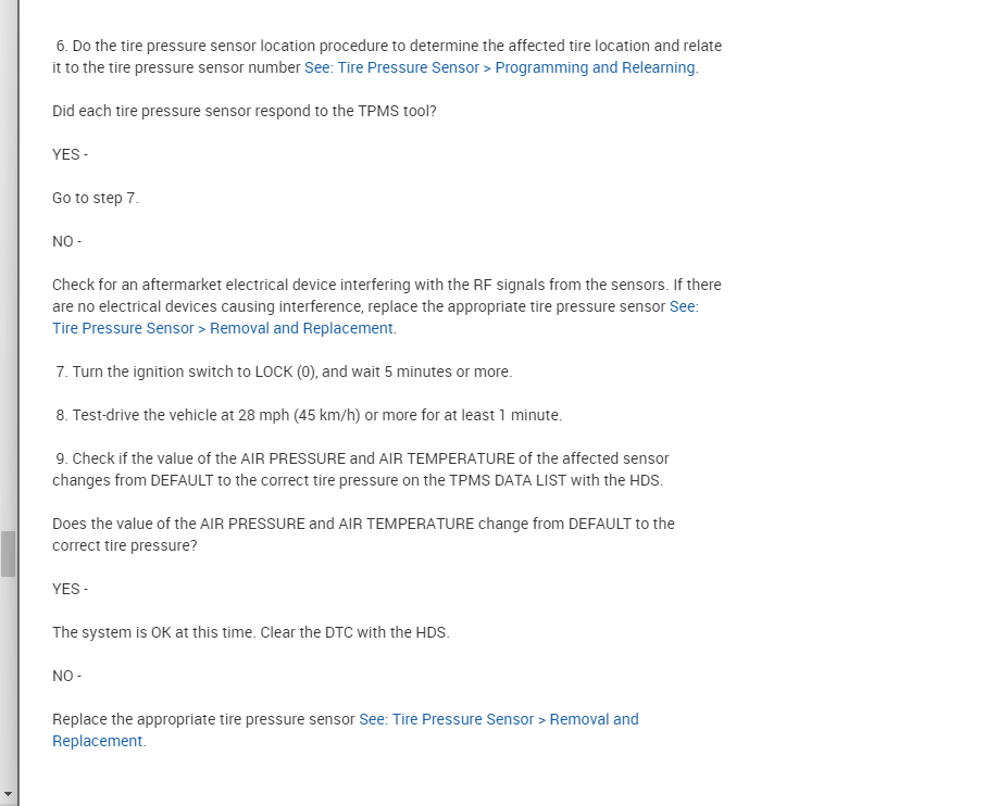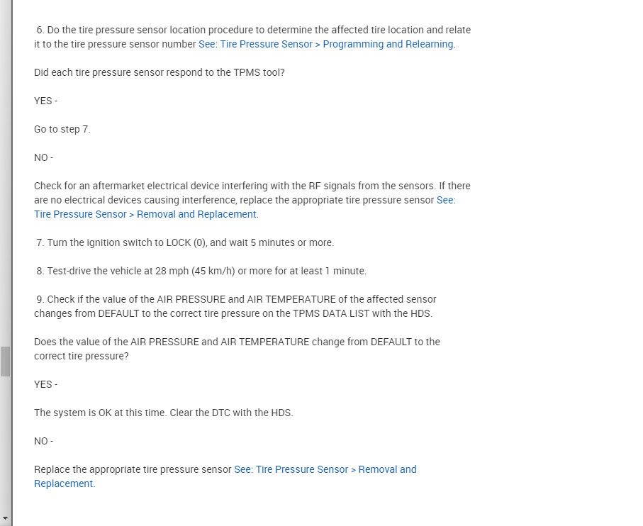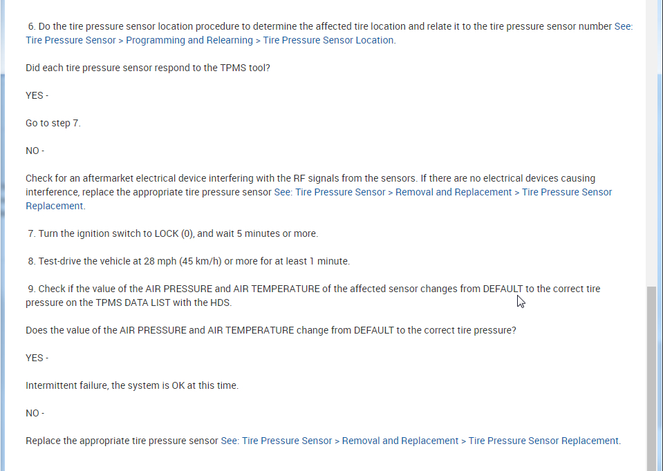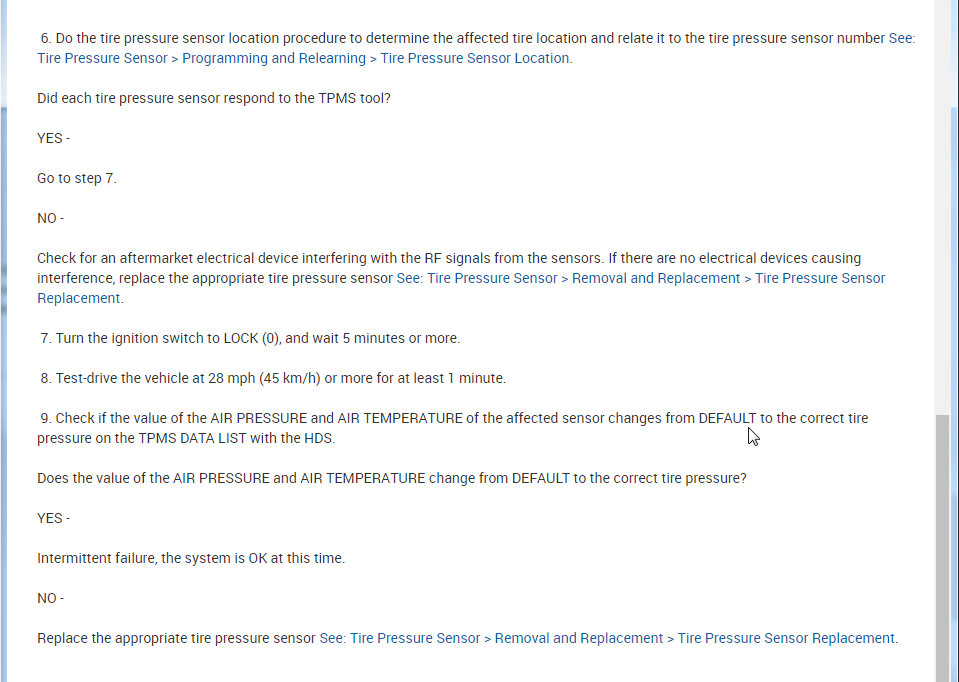 9. Check if the value of the AIR PRESSURE and AIR TEMPERATURE of the affected sensor changes from DEFAULT to the correct tire pressure on the TPMS DATA LIST with the HDS.