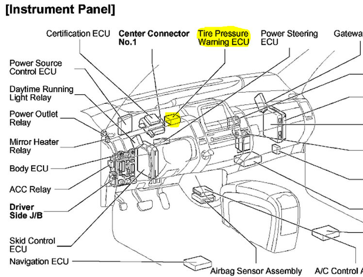 The TPMS module is located behind the passenger side dash panel or behind the instrument cluster.