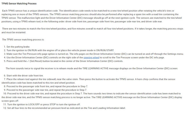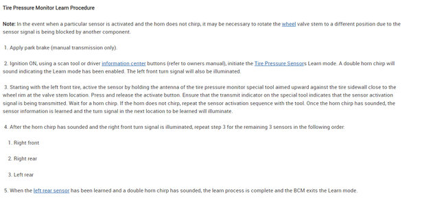 This is for all the codes you have setting. If you have anything plugged into power ports (ie, phone chargers, USB devices, etc, ) take those out while attempting the relearn procedure since this is solely based on radio frequency. But see if any of this information helps you, and I will do a little further research to see if there is anything else that will hinder the sensors from the procedure.