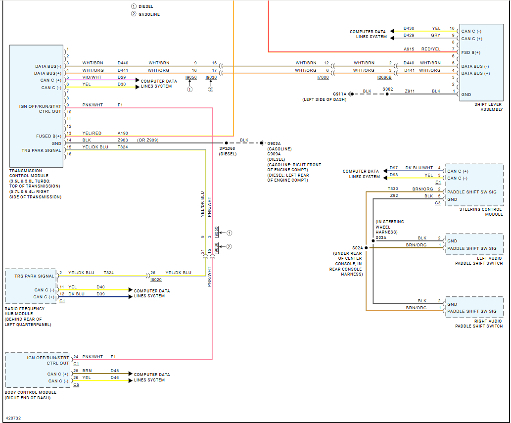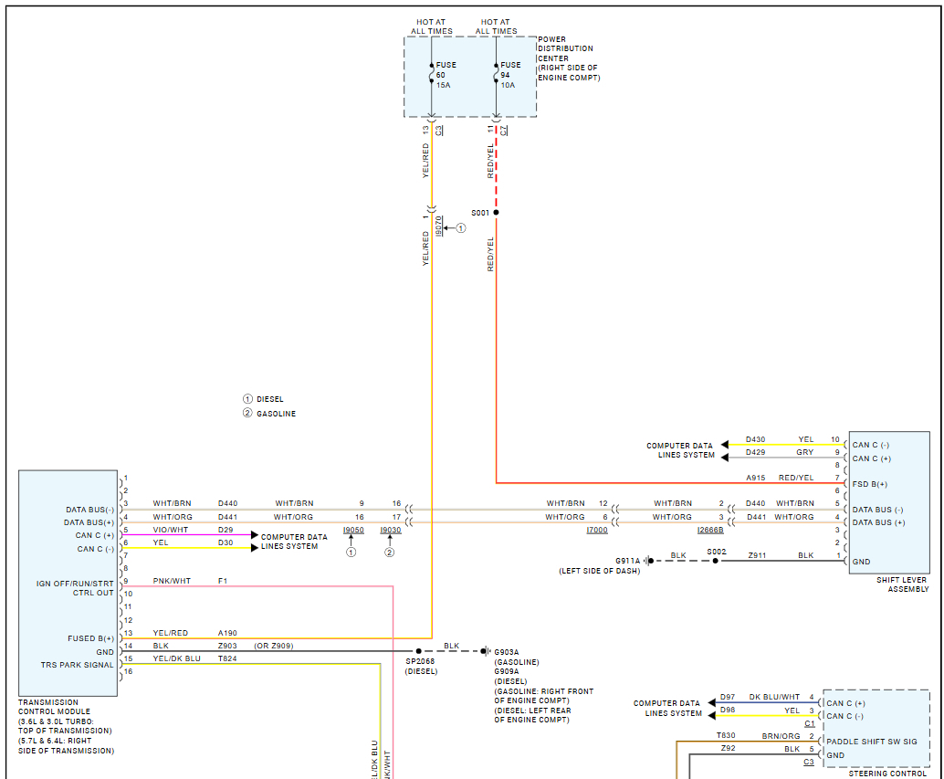 My 2014 Grand Cherokee Summit hasn't started for two weeks, and when I press the start button, the dashboard won't turn off. I think the transmission is disconnected or has an open circuit. Does anyone have a wiring diagram? It displays messages such as: (Vehicle Not in Park) (Until You Reach a Desired Location You May Not Be Able to Shift Again Until Serviced.) (Service Transmission Continue in D. Do Not Shift or Turn Engine Off)