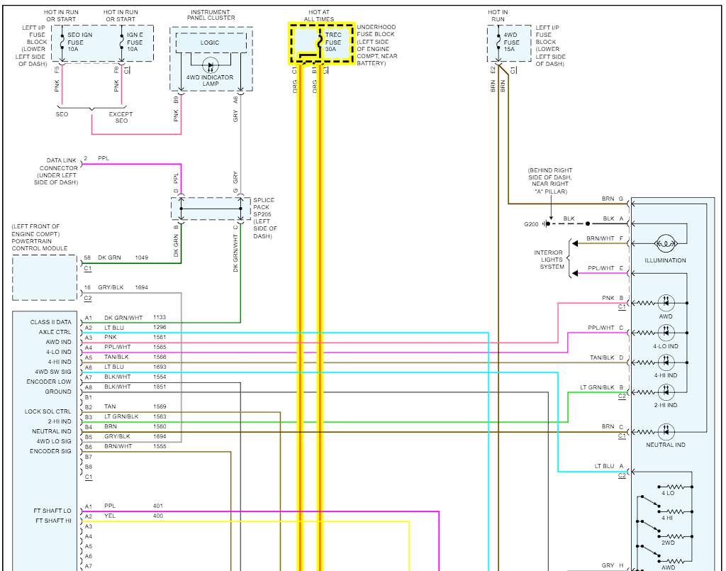 I have a 2003 1500 HD. I had a C0306 code but the service 4wd light only came on when driving in the rain. I was preparing to drive on the beach, and I shifted into neutral. Then shifted the transfer case from 2wd to 4wd high then as I shifted into 4wd low the selector switch lights went out, the service 4wd light came on and the 30-amp fuse blew. I tried to shift into gear, but I heard a loud grinding noise. The transfer case was in neutral. Next, I pushed it onto the street and flat towed it a half mile away. Next, I used a spare fuse to force the transfer case in 2wd and the fuse blew again.