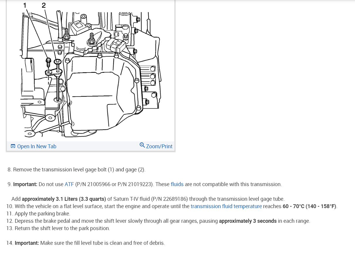 Add approximately 3.1 Liters (3.3 Qt) of Saturn T-IV fluid (P/N 22689186) through the transmission level gauge tube.