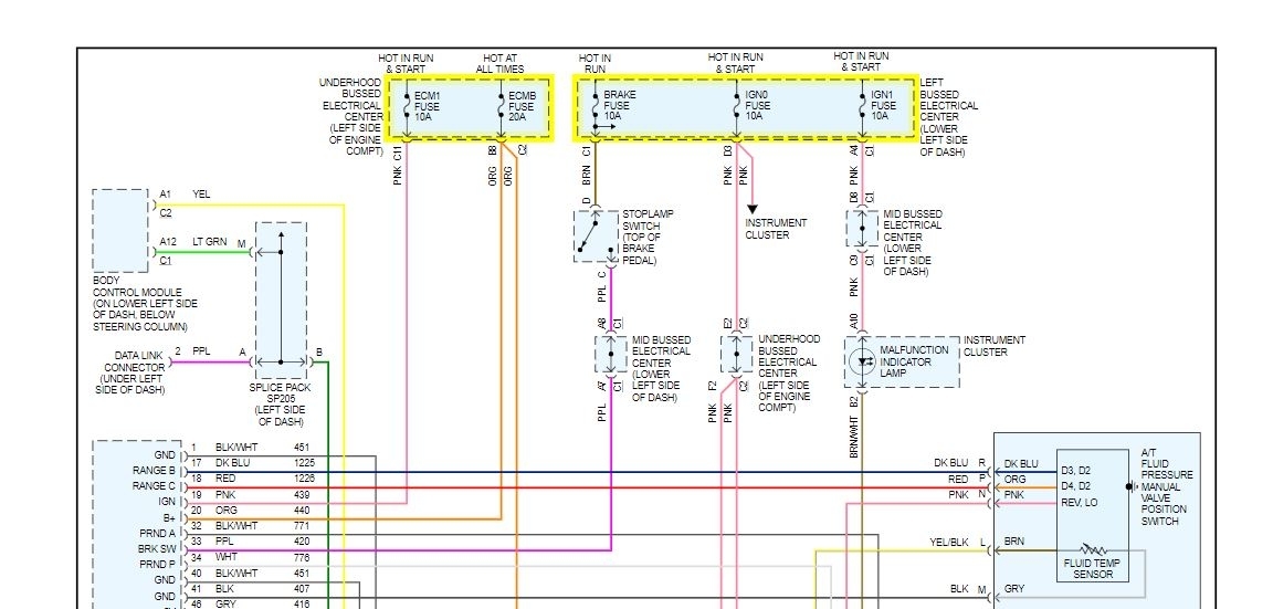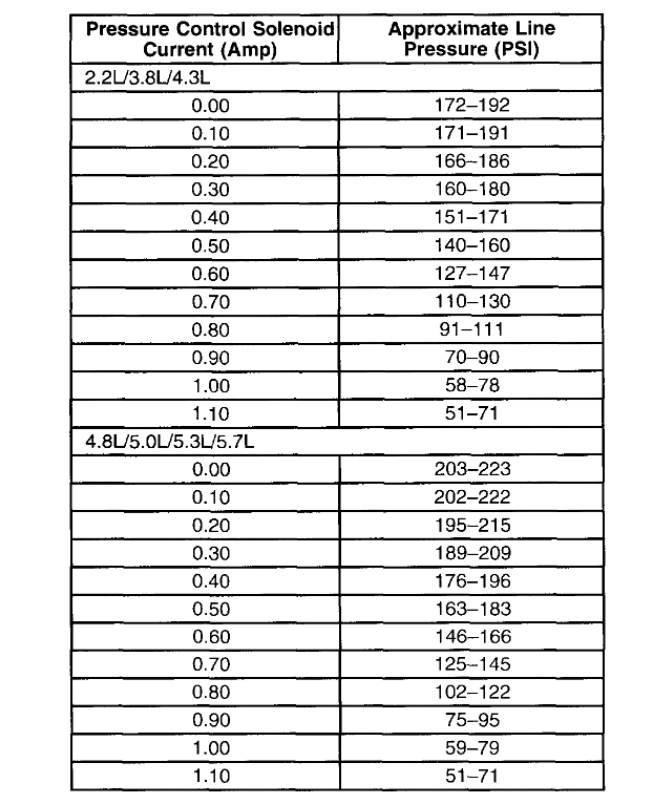 Before performing a line pressure check, verify that the Pressure Control (PC) solenoid for the transmission is receiving the correct electrical signal from the PCM: