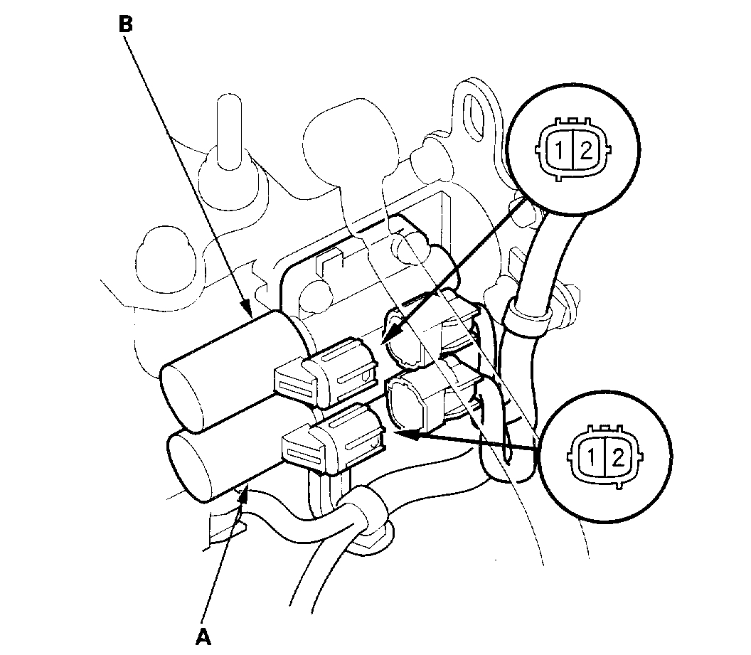 7. Connect the No. 1 terminal of the A/T clutch pressure control solenoid valves A and B to the battery positive terminal, and connect the No. 2 terminal to the battery negative terminal. Make sure the A/T clutch pressure control solenoid valves A (A) and B (B) move.