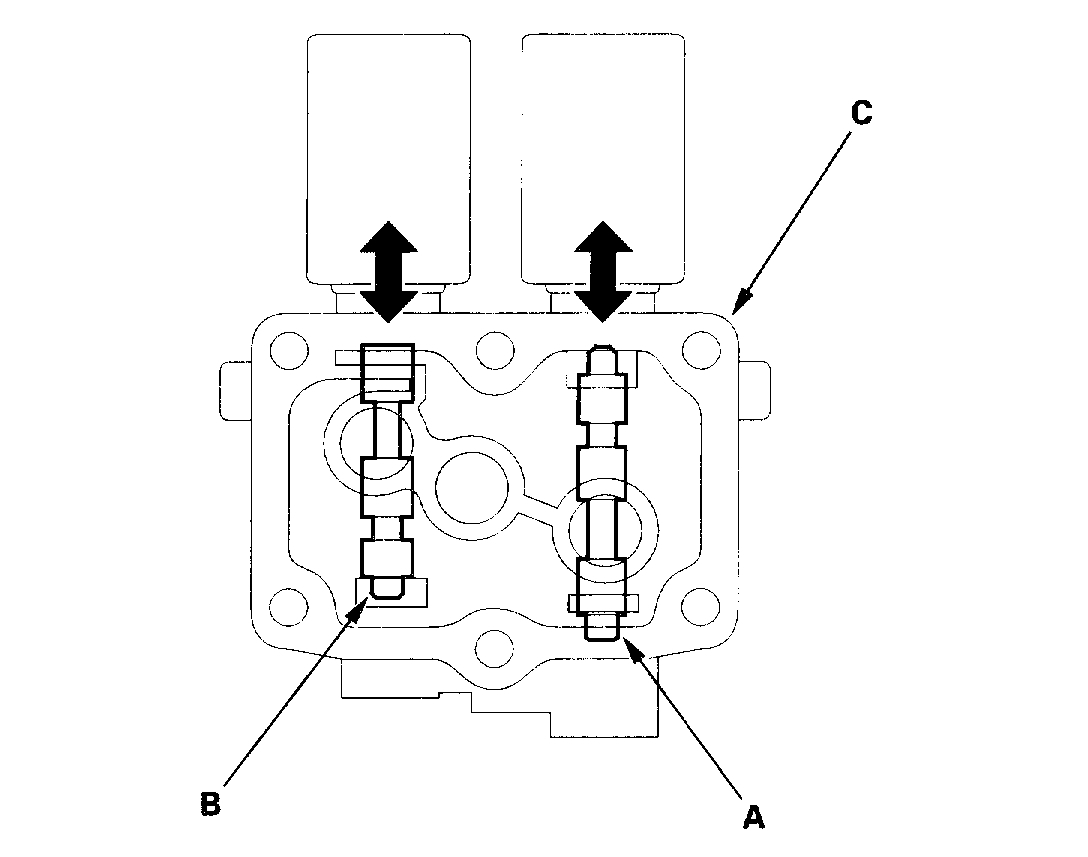 NOTE: You can see the valve movement through the fluid passage in the mounting surface of the A/T clutch pressure control solenoid valves A and B body (C).