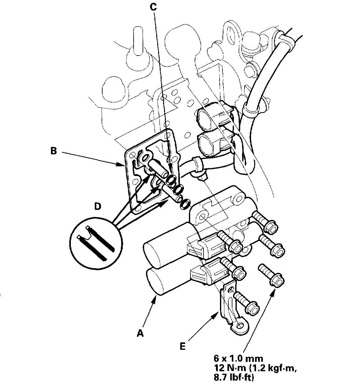 3. Install a new A/T clutch pressure control solenoid valves A and B with a new gasket (B), new O-rings (C), ATF feed pipes (D), and harness clamp bracket (E).