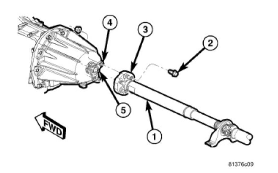 5. Slide the propeller shaft (1) rearward until the coupler clears the propeller shaft pilot (5) on the transmission output shaft.