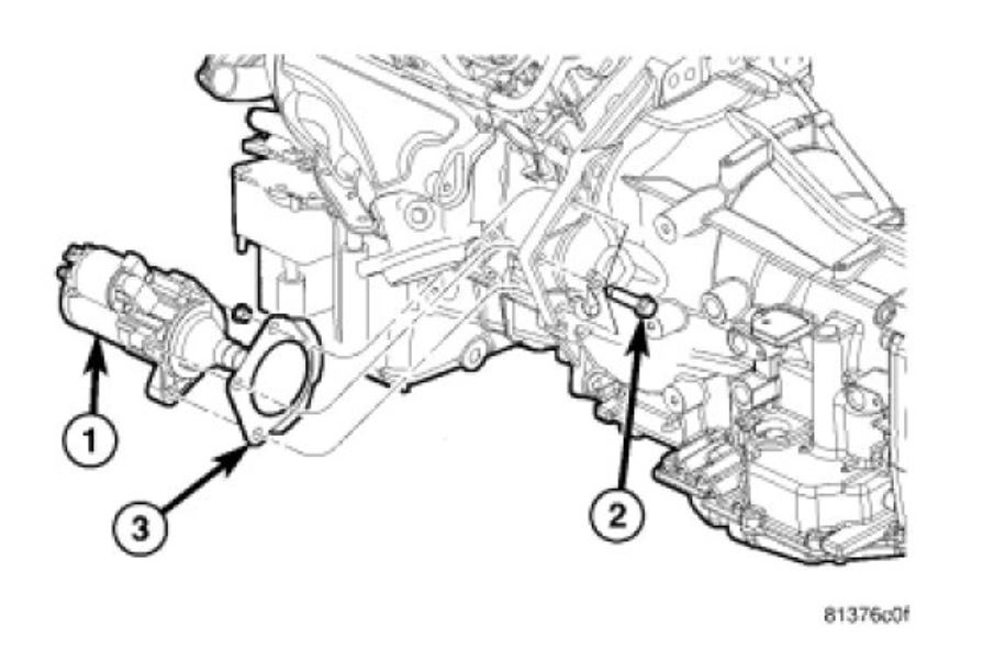 6. Remove the bolts (2) holding the starter motor (1) to the transmission.