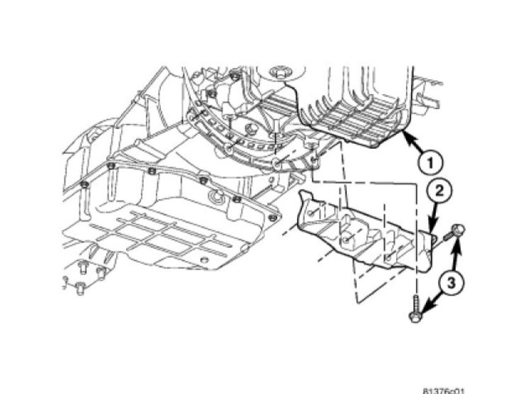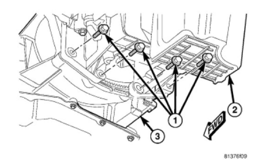 27. Remove the bolts (1) holding the engine oil pan (2) to the transmission (3).
