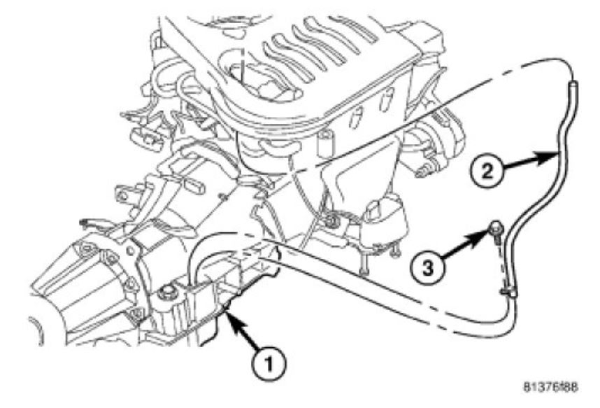 19. Remove the bolt (3) holding the transmission fill tube (2) to the transmission (1).