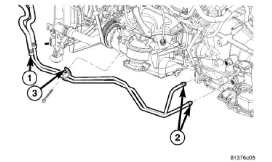 21. Disconnect transmission fluid cooler lines (1) at transmission fittings (2) and clips (3).