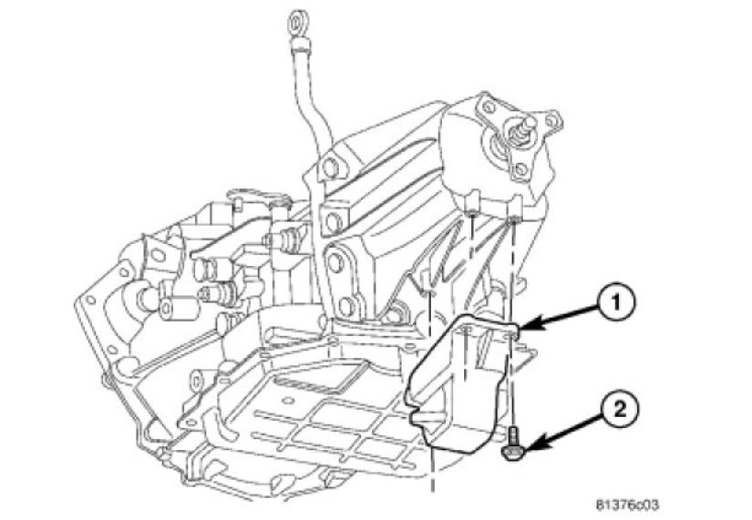 13. Loosen the bolts holding the shift cable retaining strap (2) to the transmission.