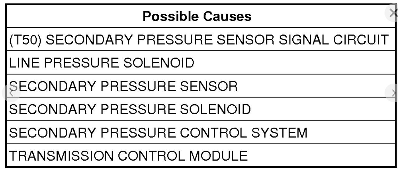 When the secondary pressure goes down gradually below a predetermined value during a drive cycle. The DTC could be due to the failure of the secondary pressure control system, secondary pressure solenoid performance or line pressure solenoid. There are two possible setting conditions to set this DTC.