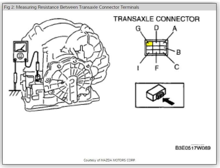 2. Measure the resistance between terminal G and Ground(transmission case). You should see a resistance value of 1.0 - 4.2 ohms. If the reading is less than 1.0(close to zero), inspect the transmission harness for a rub through/chafed wire. If the reading is greater than 4.2(or meter indicates "OL"), inspect the harness for a broken wire or heavy corrosion.