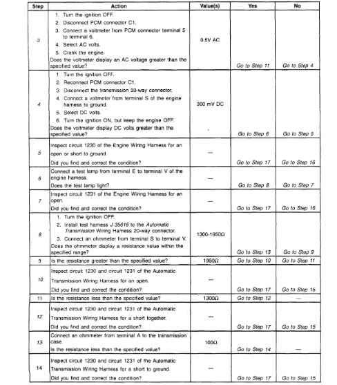 10. This Step inspects circuit 1230 and circuit 1231 of the Automatic Transmission Wiring Harness for an open, if the resistance value is greater than 1950 ohms. You must replace the transmission harness, if you find an open in the harness.