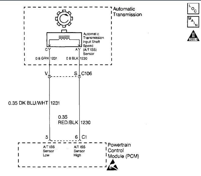 The Automatic Transmission input (Shaft) Speed (A/T ISS) sensor is a permanent magnet with a coil of wire wound around it. The A/T ISS sensor mounts in the transmission case facing the drive sprocket of the input shaft. An air gap of 0.045-0.109 in. Between the sensor and the drive sprocket must be maintained so that an accurate AC voltage can be transmitted. Sensor voltage varies from 0.5 volts AC at 100 RPM to more than 100 volts at 8000 RPM. The A/T ISS sensor has a resistance value of 1300-1950 ohms.