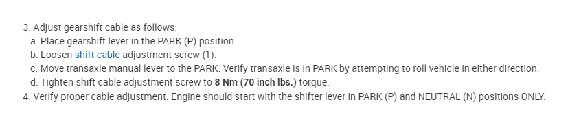 I have replaced the transmission cable okay. New problem before I attached new cable I moved the lever on top of transmission all the way forward and attached the new cord but it still says it's in reverse as first gear instead of park have been just usings cord to change gears temporarily until the gear shift stick assembly comes in it seems to only go into reverse as far forward I can get it to go in gear terms it won't go into park gear now and won't release keys unless in park. I'm not sure what happened. The cord was specifically for my model and engine. I'm confused on why park seems to no longer exist on the cord! Please help!