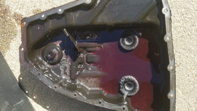 I flushed the transmission oil by removing the outlet tube from the "cooler outlet" and started the engine (jacked up) and put the shifter in D position and kept replenishing it with new oil. There was a pretty strong jet of fluid coming out of the "cooler outlet". I have also replaced the transmission oil filter. Please see the oil pan image with worn out metal deposit on magnets and some small chunks of metal in the pan.
