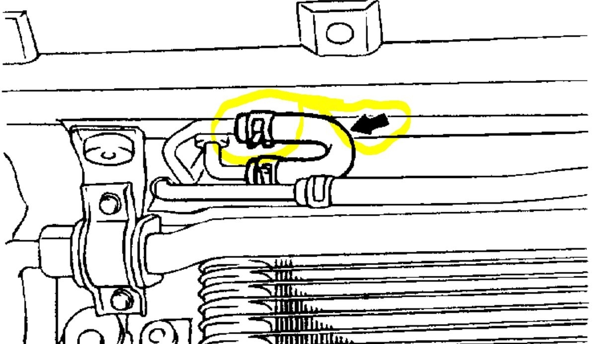 1. Disconnect the hose shown in the illustration (first image) which connects the transmission and the oil cooler. Place a container under the hose to collect the discharge.