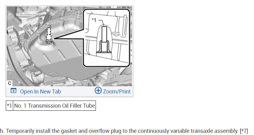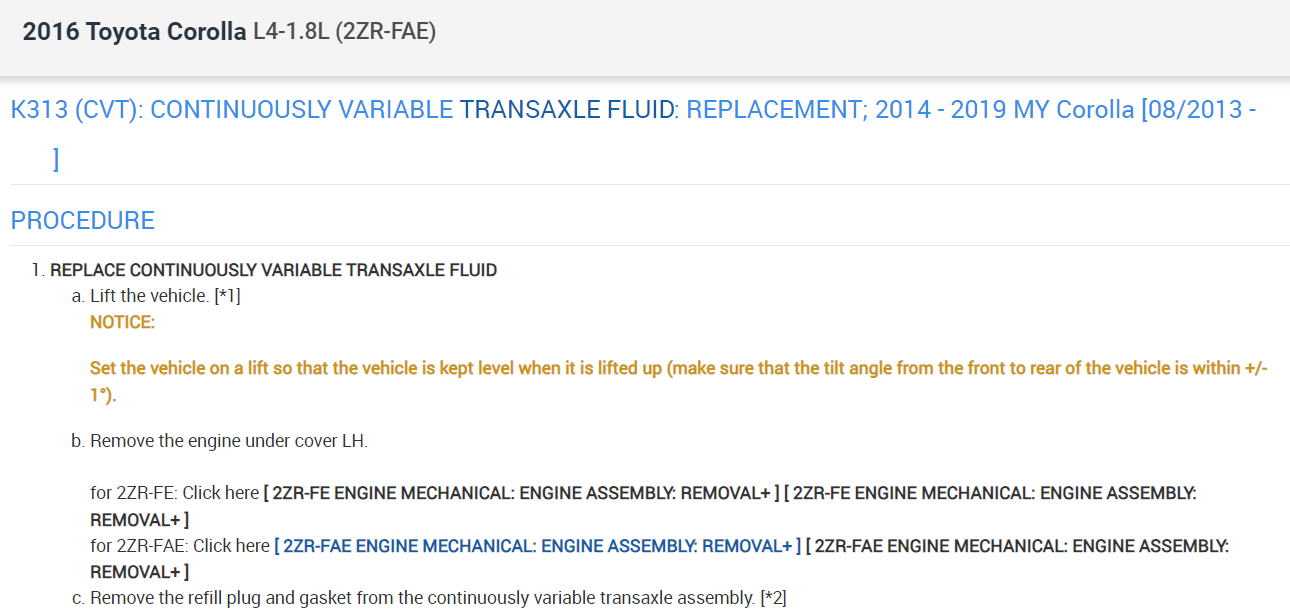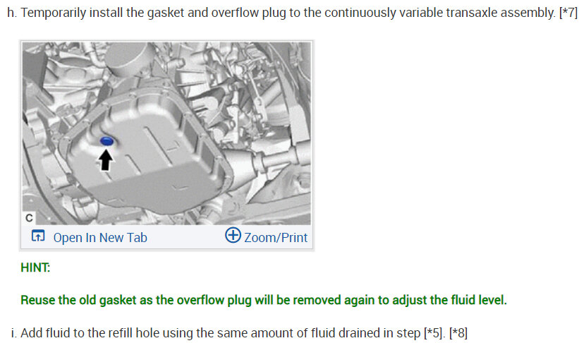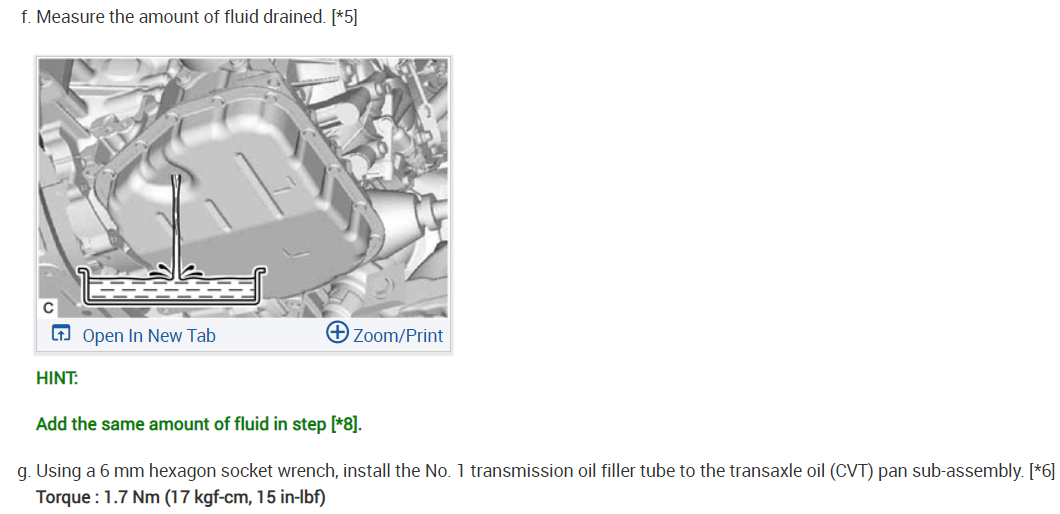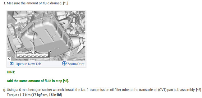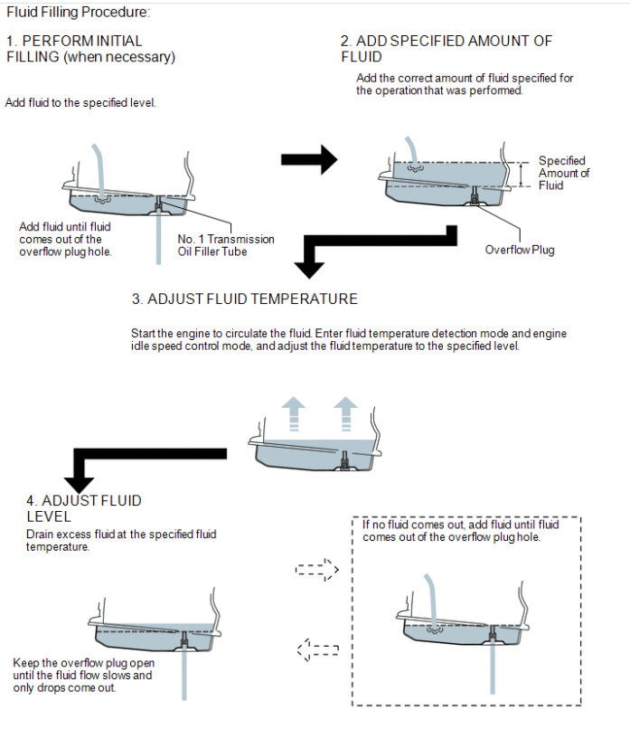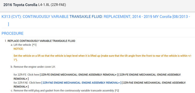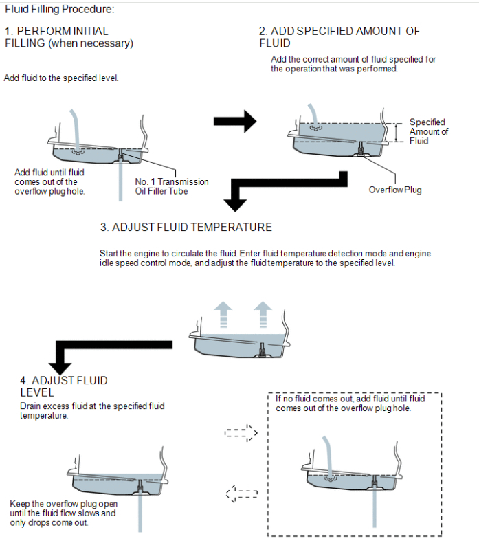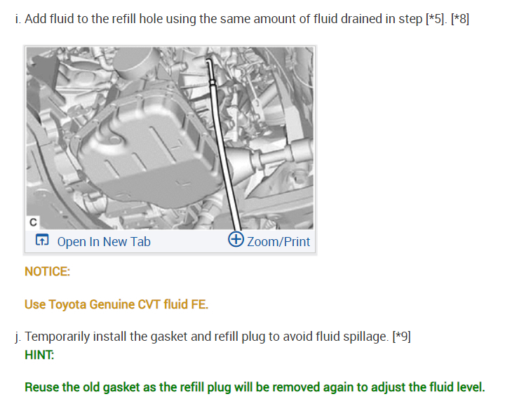 Since this is a CVT transmission, do not add traditional automatic fluid to it. It does require a specific type of fluid designed specifically for this design. Make sure to use Toyota Genuine CVT fluid FE or equivalent.