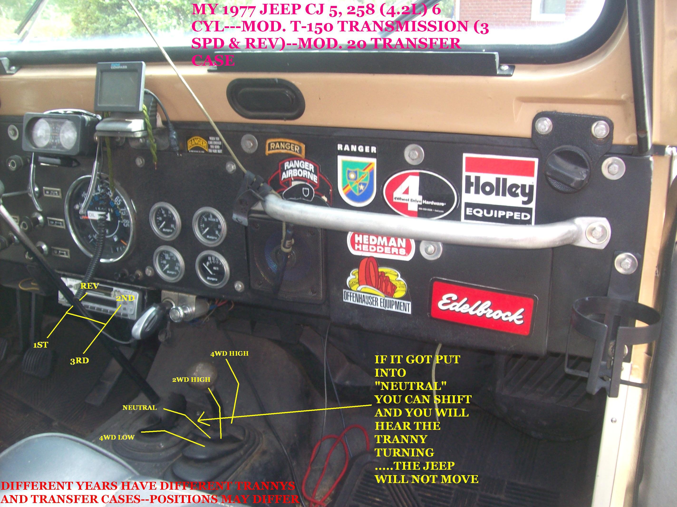 Was absolutely thrilled to read that one of you there is a Jeep CJ guy - hope you can help me out. Firstly, the year and model of my jeep as stated may not be correct. But it's definitely either CJ5, 6 or 7. The jeep was running fine when all of a sudden with no prior warning of any kind, it would not shift or engage into any gear and remains in Free. Even with the engine OFF I still couldn't engage any gear. For ex. With engine off, I push lever into 1st gear. It does feel like its engaged. Then I start the jeep (without clutching) and it should jerk forward right? In my case - no, it just remain in Free gear. So what's up doc?