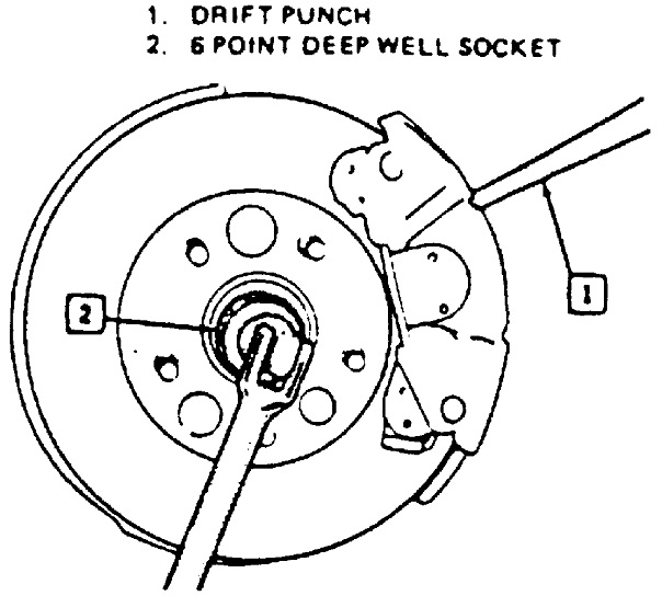 7. Insert a screwdriver or drift into caliper and rotor to prevent rotor from turning, Fig. 7.
