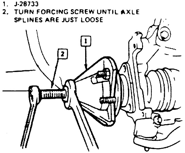 6. Remove drive axle from hub and bearing assembly using front hub spindle remover tool No. J-28733-A, or equivalent, Fig. 8.