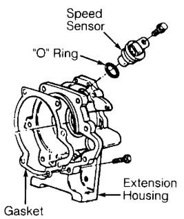 1. Disconnect electrical connector at speed sensor located on rear of transmission. See Figure. Remove speed sensor bolt, speed sensor and "O" ring.