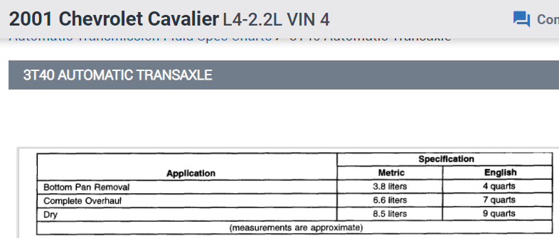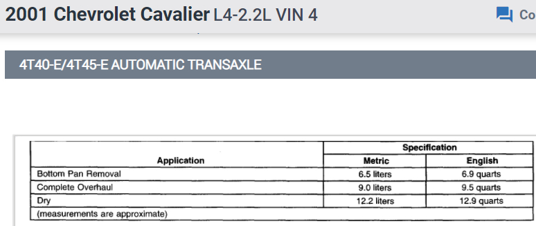 I've attached 2 pictures below of the transmission capacities you've requested. One is for a 3 speed automatic and the second is for a 4 speed automatic. I've attached both below. Both use DEXRON- III type transmission fluid. Hope this helps and thanks for using 2CarPros.