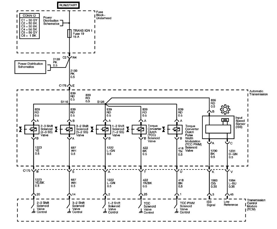 The automatic transmission input shaft speed (AT ISS) sensor assembly is a three-wire hall-effect sensor that is mounted internally to the transmission on the oil pump assembly. The AT ISS utilizes the gear teeth, located on the turbine shaft, to generate a voltage signal of varying frequency that corresponds to the rotational speed of the turbine shaft. The AT ISS signal is an input to the transmission control module (TCM) and is used to determine line pressure, transmission shift patterns, torque converter clutch (TCC) slip speed and gear ratio.