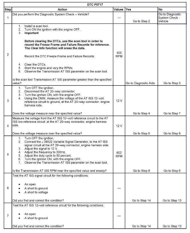 If the TCM detects AT ISS input less than 100 RPM with the engine running, DTC P0717 sets. DTC P0717 is a type B DTC.