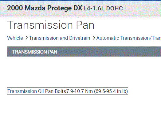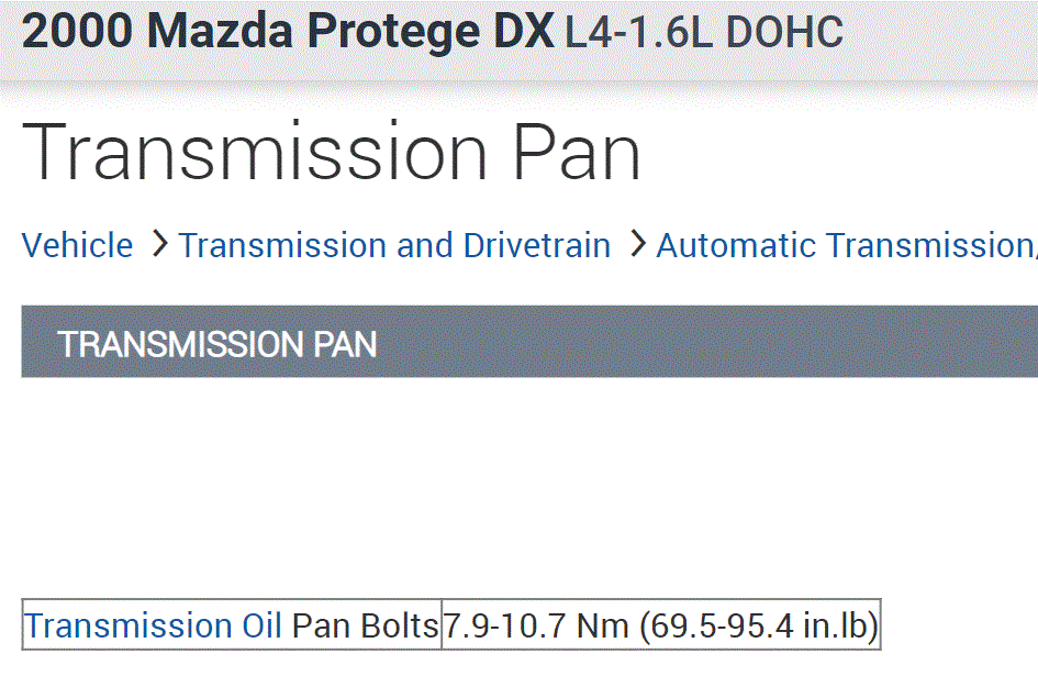 What would be the torque specs for the Transmission pan bolts and Drain plug during reassembly?