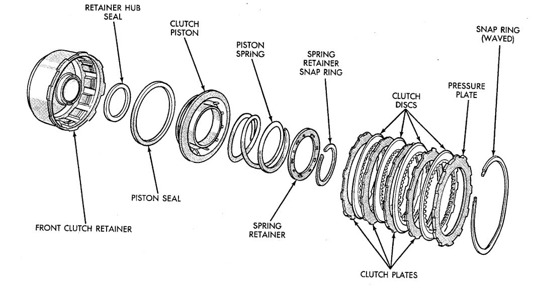 NOTE: The 42RE transmission uses four plates and discs for the front clutch. The 44RE transmission uses five plates and discs for the front clutch. The front clutch retainer is not interchangeable between the 42/44RE transmissions.